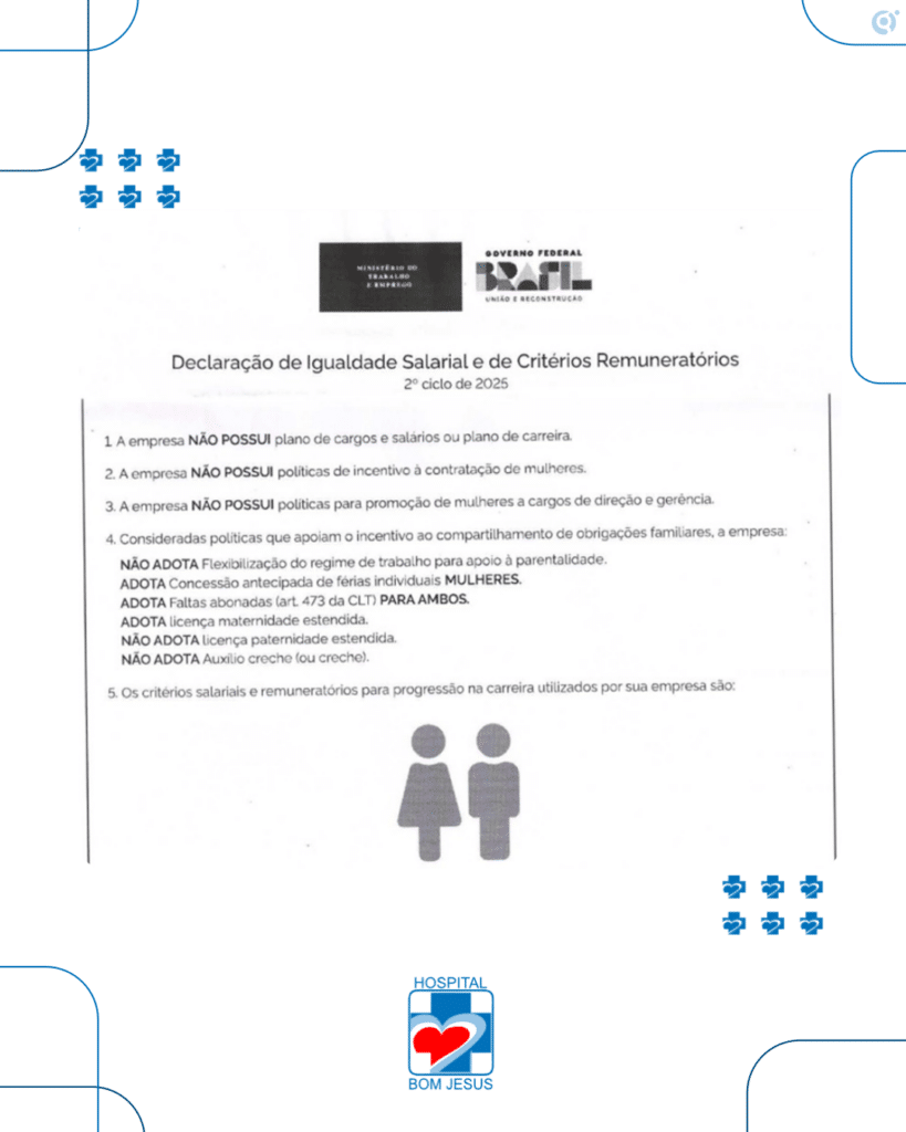 O Hospital Bom Jesus tem o compromisso de promover e manter um ambiente de trabalho justo e equitativo. Por isso, temos o prazer de informar que a Associação Hospitalar Bom Jesus está em dia com esse compromisso, conforme a Declaração de Igualdade Salarial do segundo semestre de 2025.